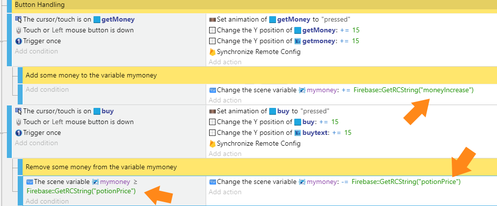 As you see, we use 2 variables in this example: one to decide how much money you win and one for how much you lose when clicking the buttons.