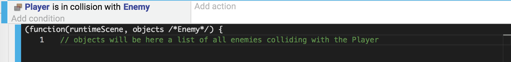 This array is exactly like what an action or a condition would use. For example, the illustration below is an event using a JavaScript event as a sub-event. The JavaScript event will manipulate the enemies that are colliding with the player: