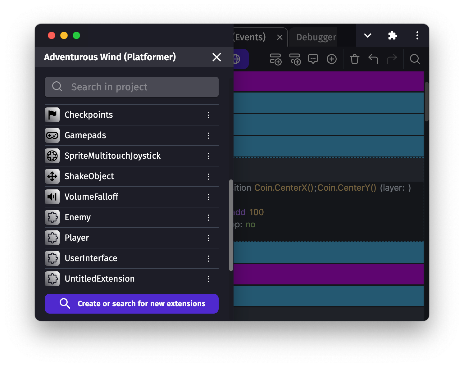 It's possible to easily create new extensions, using the same events that you're using in the scenes. It's a powerful feature that allows you to organize your game and extend your objects.
