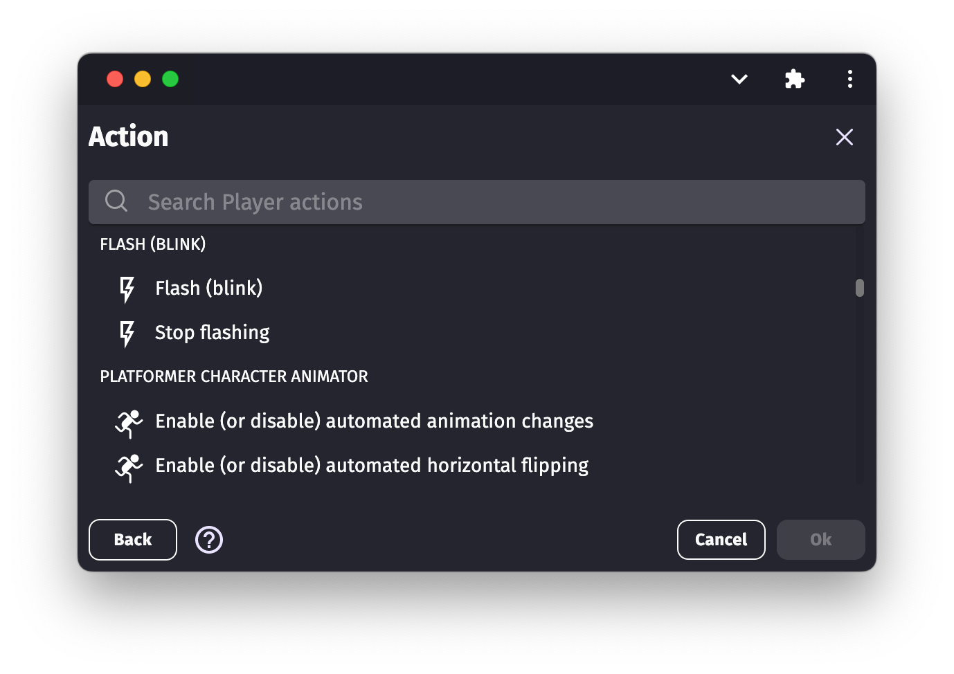 - Even if no behavior is provided, you'll have some actions or conditions. Find them in the list of actions or conditions when editing an event. The name of the category containing them is the same as the extension.