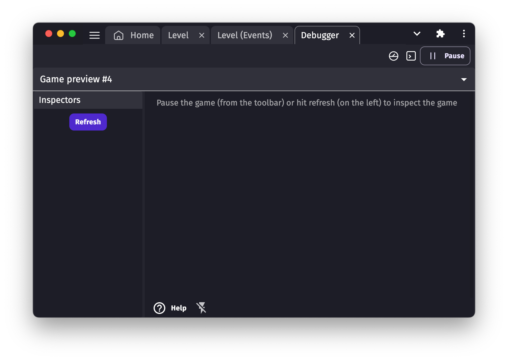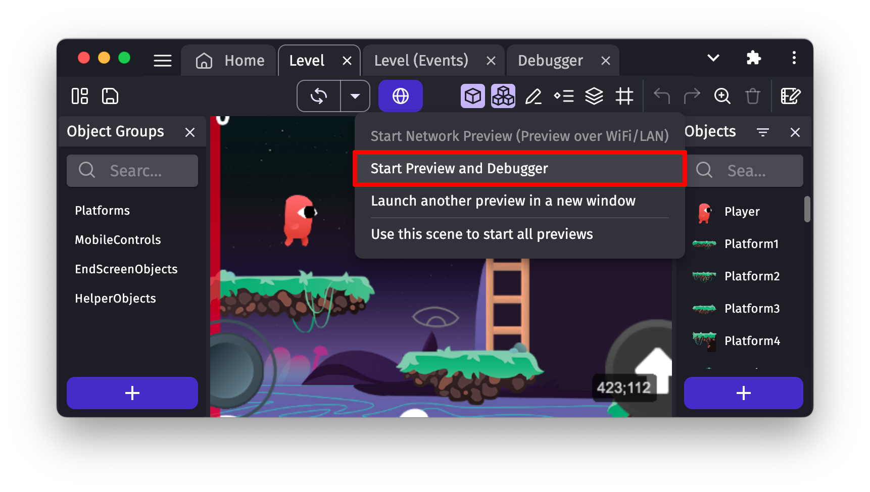 This will open a new tab called "Debugger" and will also launch a preview of your game as usual.
