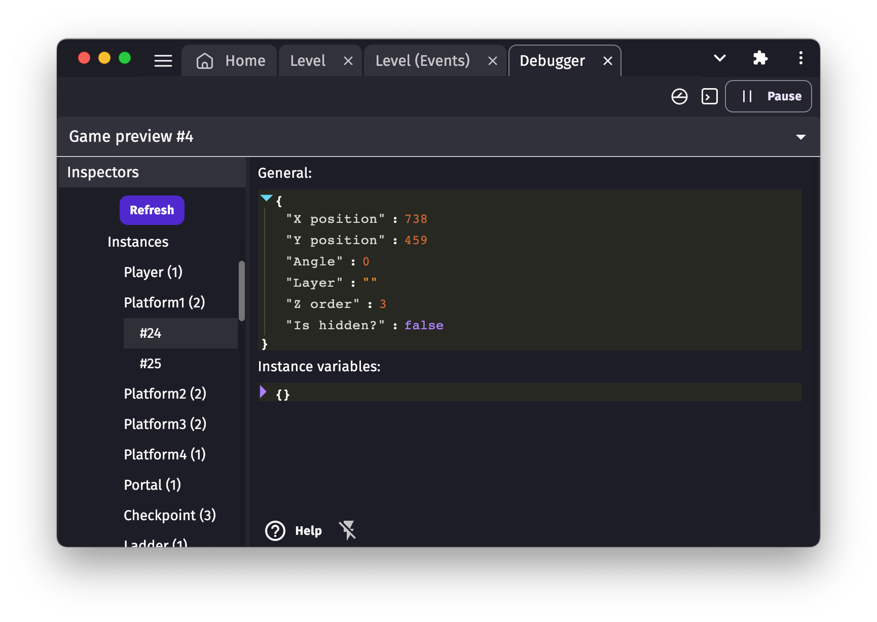 The Debugger is a tool that lets you inspect the contents of your game. Allowing you to inspect the global variables, scene variables, and variables of instances of your objects. You can pause the game at any time, and check to see why something isn't working as intended or to do quick tests in your game.