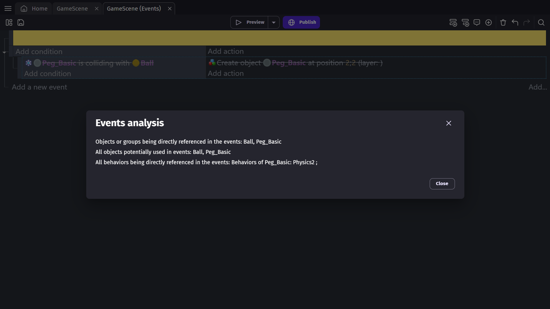 You can add any number of event blocks to the Event editor. Each event can have various conditions and actions. Once you add an event, you can use the conditions and actions to create the game's logic. Read more about conditions and actions.