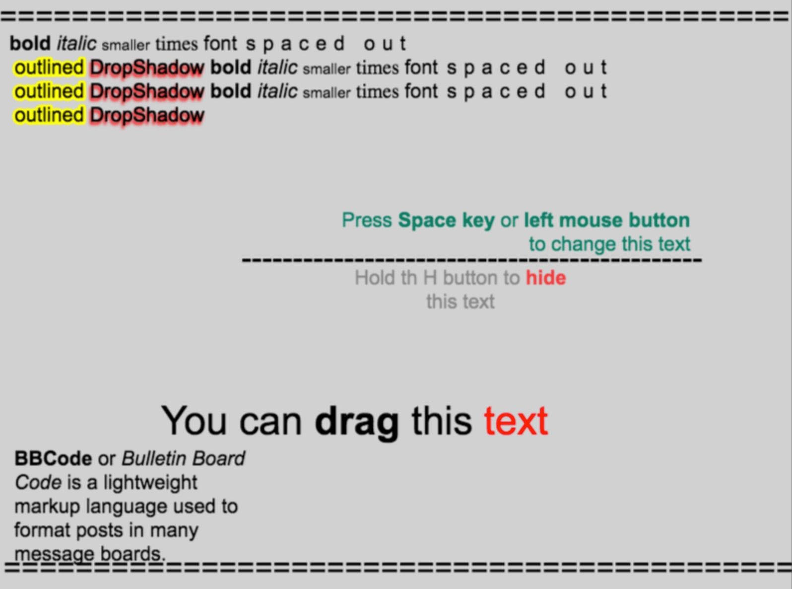 [outline=#hexColor]text with an outline in a specified color[/outline][shadow=#hexColor]text with a dropshadow with a specified color[/shadow][spacing=12] text with extra spacing between the letters[/spacing][align=center]text that is centered (you can also use left and right)[/align]