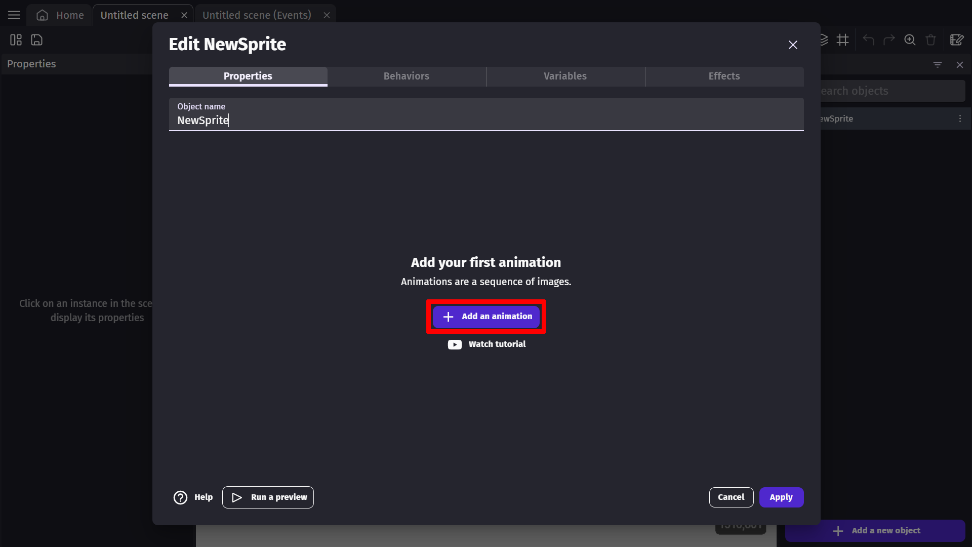 An animation allows you to add an image or series of images to the sprite object. To add an animation, click the Add an animation button.