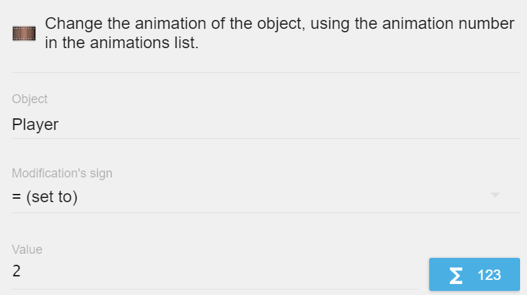 We also need to make the character play the Run animation when he is on floor. Since we have already made an event to check the "Is on floor" condition, we can simply add another action for this same event. Click Add an action->Sprites->Animation and images->Change the animation. Then fill in the object and the correct animation identifier to play that particular animation. For this game, we saved our Run animation at the identifier 2. You can also use the animation name as an identifier. To refer to animations using their name, you should use the Change the animation (by name) option instead. If you use a name, don't forget to put the name within quotes (") as it is a string.