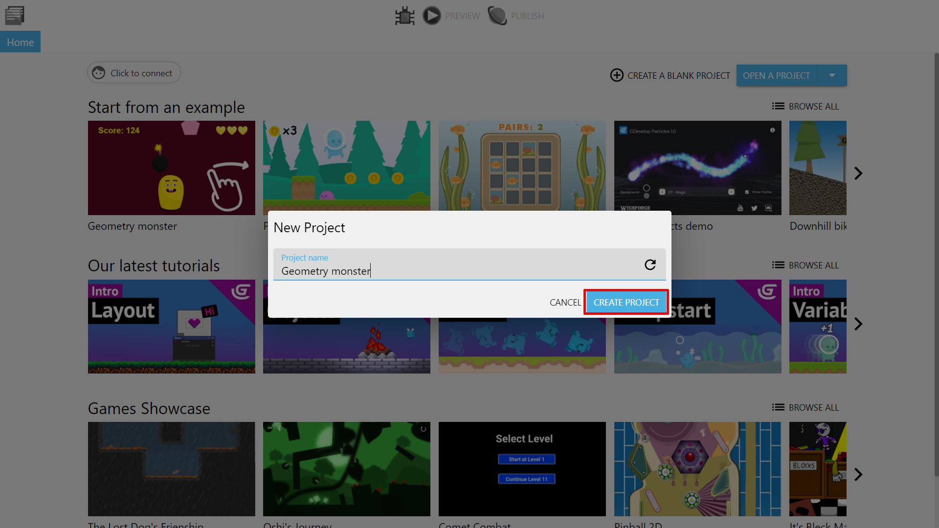 Clicking on that will show a popup window where you can name your new project. Name it and press "create project" to begin.