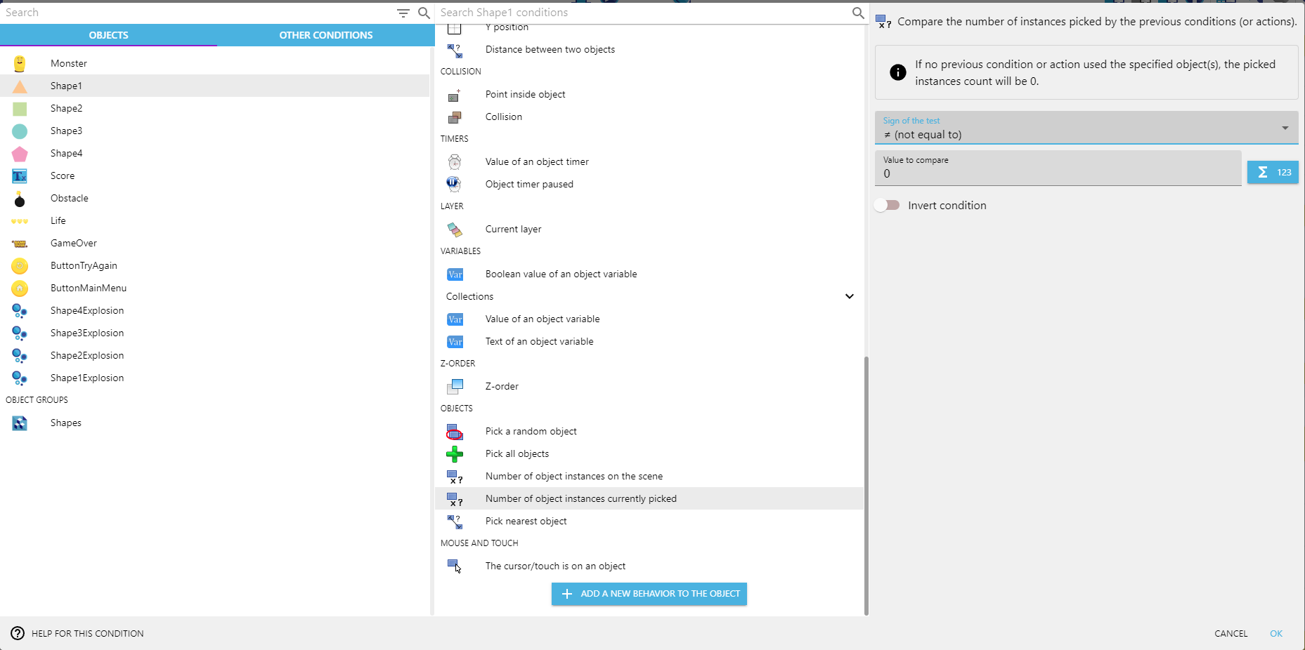 Select Shape1 from the list of objects, look for "Number of objects instances currently picked", and then "≠ (not equal to)" and 0 in the right panel.