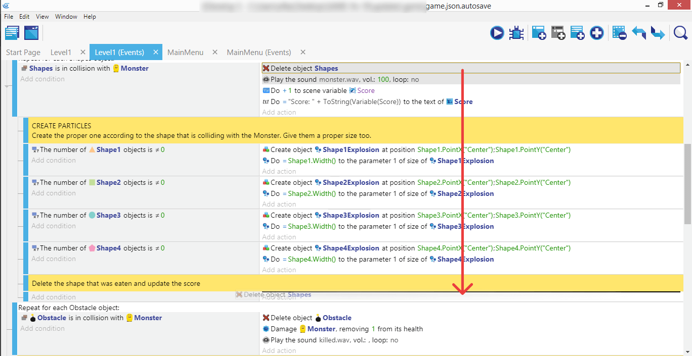 In this last piece we're introducing little bits that can make the game really stand out: progressively increasing the difficulty level, and spawning particle effects when Monster is collecting the shapes.
