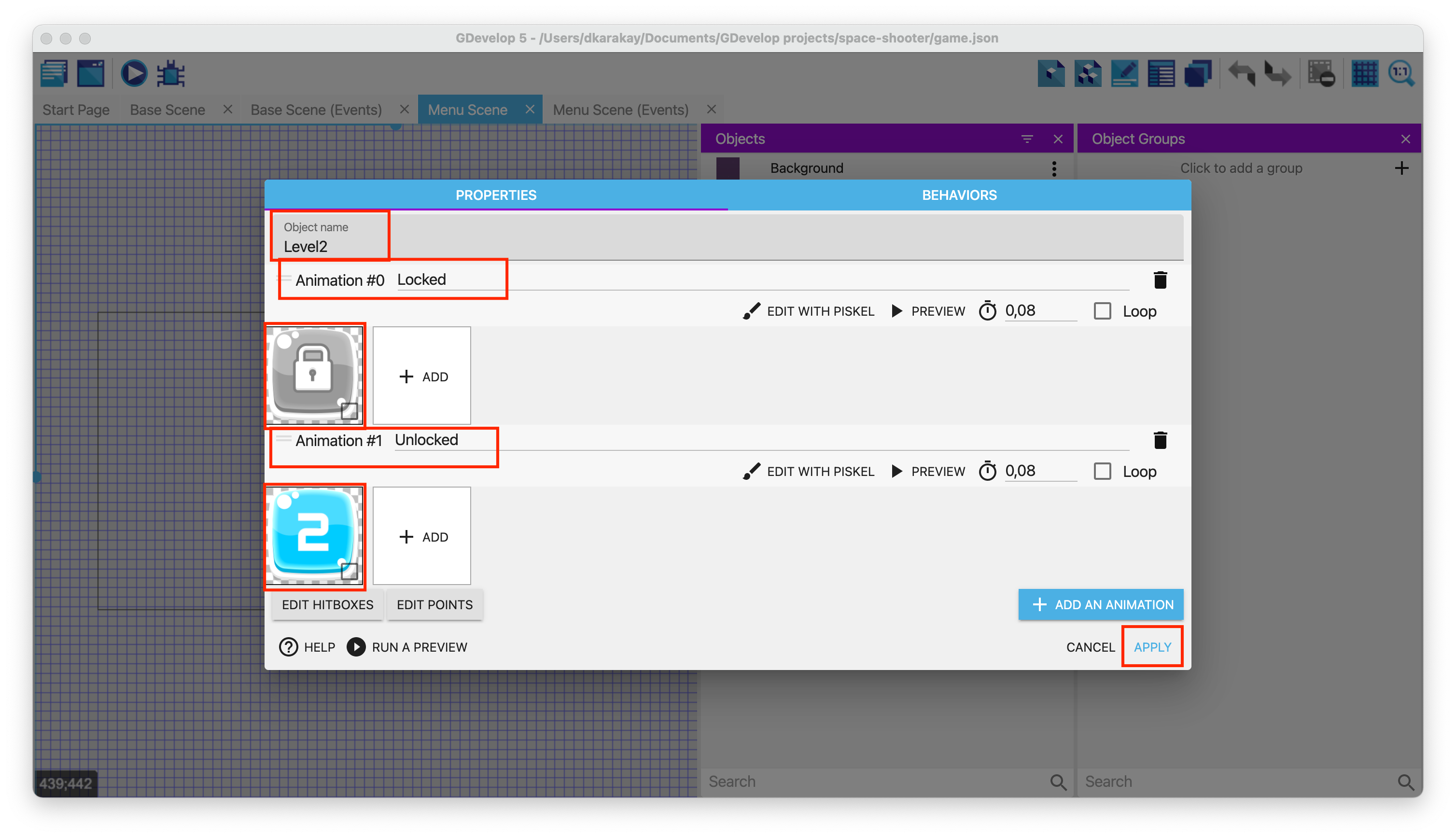 Add a new object called Level2 select the image button_locked.png from the assets folder. Set the animation name to "Locked". To create a new animation, select the image button_level_2.png, and use "Unlocked" in the name field.