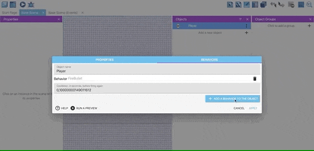 In this chapter, we will learn how to use Behaviours in our game. You can read the Behaviors page to learn more about them. Behaviors add extra capabilities to objects. All objects can have one or more behaviors attached to it.