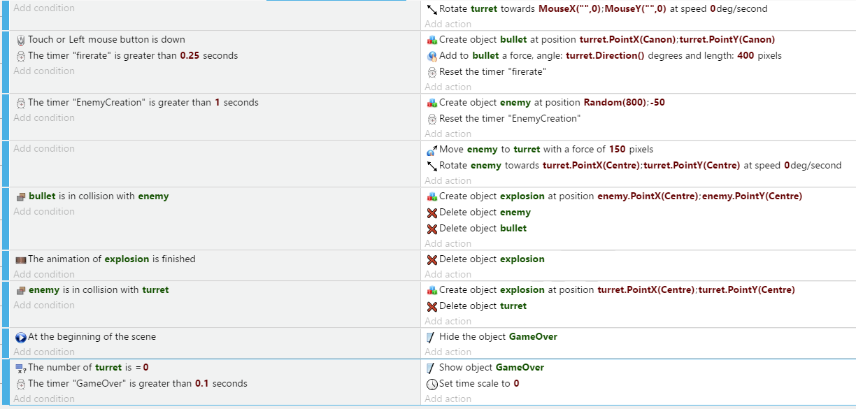 The only thing is left to do is to tell GDevelop to fire the bullets from the "Canon" point of the "turret" object. So in our "create bullet" action, we need to change turret.X() and turret.Y() expressions, to turret.PointX("Canon") and turret.PointY("Canon"). We can change them by clicking the expressions inside the editor.