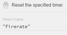 The panel appears on the right. The first parameter, "Object", indicates the name of the object. Leave it blank. The second parameter, "Timer's name", is the name of the timer. Enter “firerate”. //Do not forget the quotes around the timer's name!// Enter 0.25 in the third parameter, "Time in seconds".